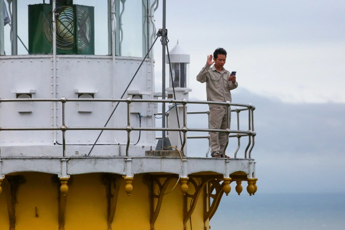 Người gác trạm hải đăng phải trèo lên tầng cao "hứng sóng" mỗi lần gọi điện thoại. Ảnh: Văn Đông