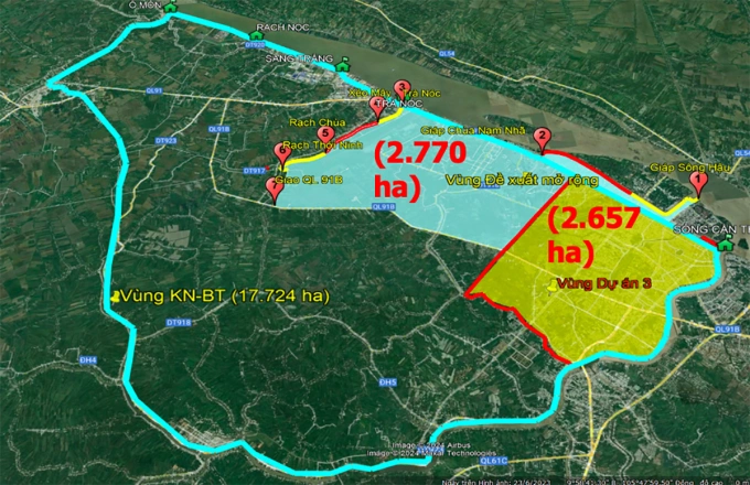 Vị trí đề xuất dự án kiểm soát ngập lụt gần 2.800 ha trong tổng quy hoạch chống ngập úng hơn 17.700 ha trung tâm Cần Thơ. Ảnh: Ban quản lý dự án