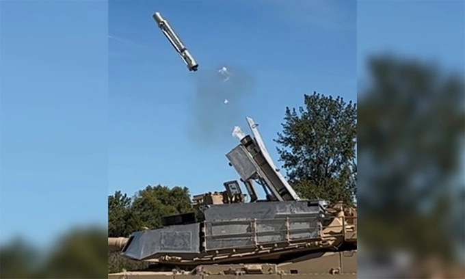 Xe tăng M1A2 SEPv3 phóng UAV Switchblade trong ảnh chụp ngày 5/12. Ảnh: GDLS