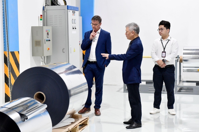 Ông Lương Ngọc Anh (phải),Chủ tịch Hội đồng quản trị Công ty TNHH Công nghệ cao Polymer Q&T,và Phó Chủ tịch Hội đồng quản trị tập đoàn Leonhard Kurz Stiftung & Co. KG bên vật liệu in tiền polymer do Q&T sản xuất. Ảnh: Polymer Q&T